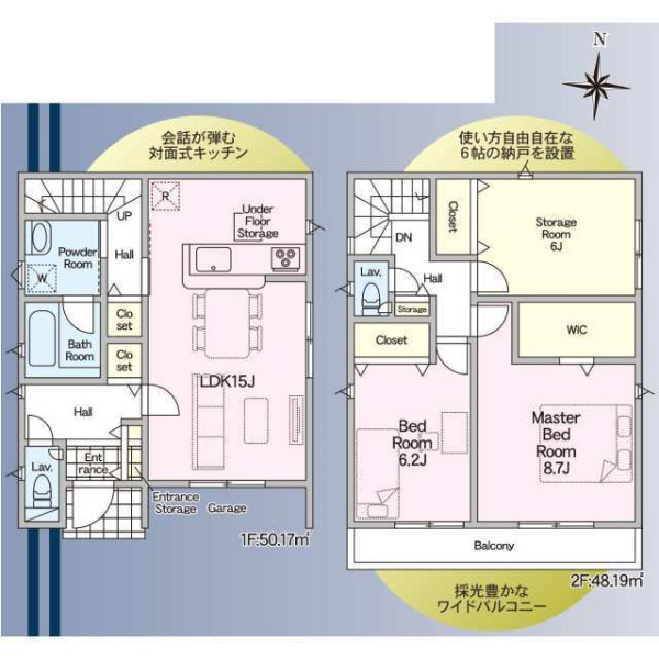 | 設備 | ガスその他、電気、上水道、下水道、システムキッチン、カウンターキッチン、浄水器、IHクッキングヒーター、給湯、トイレ2箇所、温水洗浄便座、シャンプードレッサー、浴室乾燥機、フローリング、複層ガラス、オール電化、収納スペース、ウォークインクローゼット、床下収納、駐車2台可、ディンプルキー、モニタ付インターホン、火災警報器等設置済、建設住宅性能評価取得(予定含む) | ||