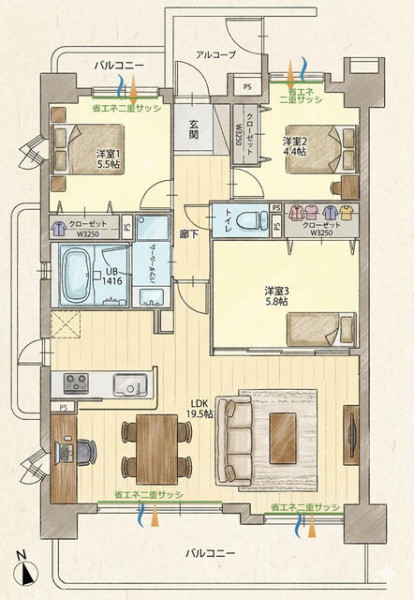 | 間取り | 3LDK | 間取り向き | (角部屋) |